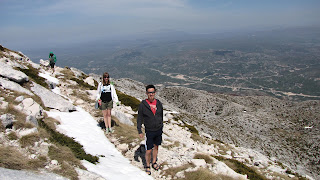 Kakšen krasen dan s krasno druščino! Vstaneva zgodaj, kljub pozni uri odhoda v posteljo in greva v trgovino po kruh. Pripravimo obilen zajtrk - dalmatinski pršut, ovčji sir, melono, lino lado in nešteto drugih namazov. Skuhamo veliko dozo kave. In že sedimo v avtu in se furamo na Sv. Jureta - 1762 m.n.m., najvišji vrh nacionalnega parka Biokovo in najvišji vrh v Dalmaciji. Nace zjutraj nekajkrat vpraša zakaj gremo ravno tja, pa kaj je sploh tam, da moremo it tja. Ampak hitro to neha spraševat, ker pot je res čudovita. 25 km vzpona, 40 Kn na osebo za vstop v park. Srečali smo veliko kolesarjev. Cesta je ozka, strma, ovinkasta, okolica pa omamna. Nace nas spretno pripelje na vrh po številnih misijah reševanja situacije srečevanja dveh nasproti si vozečih avtomobilov. Na vrhu se kepamo, v senčnih predelih se je še obdržal sneg. Res smešno, ker drugače sonce žge na polno. Na vrhu srečamo modela, ki hodi po hribih, koče so še zaprte, zato spi kar tako. Dva dni si je topil sneg, ker mu je zmanjkalo vode. Damu mu pir in je tako vesel. Predlaga nam, da gremo do sosednjega hriba z hiško na vrhu (